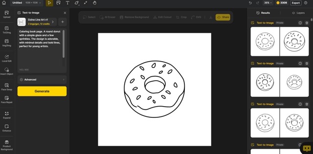 Start by opening the Txt2Img feature in the left toolbar. This is where you’ll begin crafting your design by describing what you envision for your coloring book.