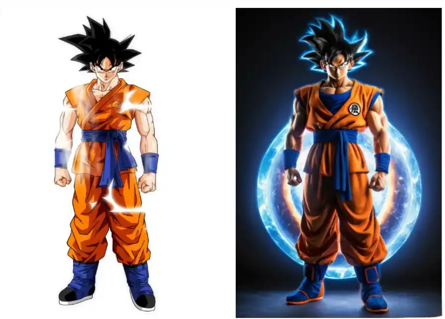 To put it more specifically, consider the production and sales process. For manufacturers of collectible figures, it’s crucial to determine if a figure’s design and attire will appeal to their audience. Imagine if there were a technology that could quickly generate preview images of 2D character figures, allowing manufacturers to survey preferences or conduct pre-order and pre-sale events. This would greatly benefit figure retailers by enabling demand-driven production and boosting sales. Take Goku, a favorite anime character among many fans, as an example. I used Dzine’s AI filter in a realistic style to transform the 2D, line-drawn Goku into a lifelike, detailed 3D version that closely resembles an actual figure. Additionally, I added a cool halo effect behind Goku, further enhancing the figure’s appeal.