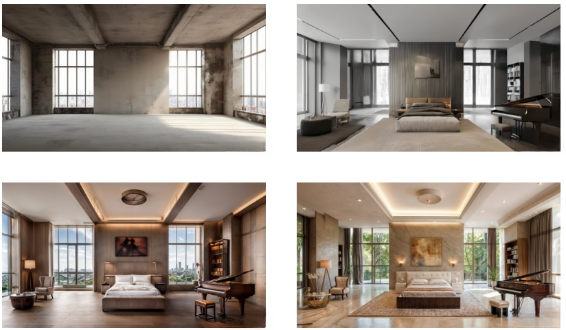 | Interior Design | Hard to convey spatial arrangements and texture details. | Converts basic layouts to detailed interiors, easily adjusting furnishings. |