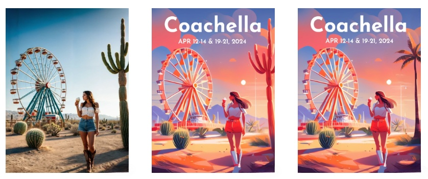 With img2img, we start with an image we’ve already found, choose the aspects we like, or start from an existing image to transform it into an artistic, unique poster. In our example, I loved an initial realistic image because it captured Coachella’s iconic elements: the Ferris wheel, mountainous terrain, bushes, and a stylishly dressed girl. Using img2img, I transformed it into a vibrant, dreamlike poster. However, the cactus on the right side of the finished image looked odd and didn’t fit Coachella’s vibe, so I used generative fill to replace it with palm trees, which looked more natural.